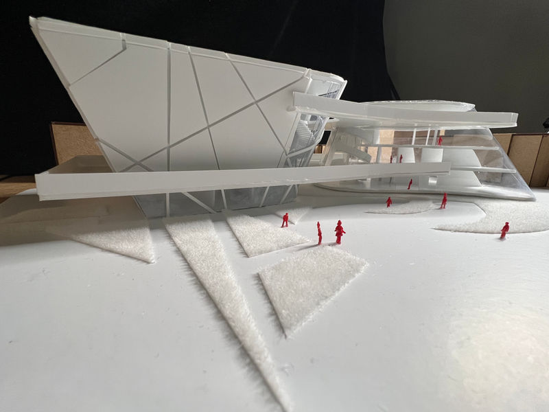 잇는 벽돌 매스로 구성했다. 물리적으로 대비되는 공간들은 한 미술관 내에서 다양한 공간 체험을 제공한다. 내벽의 움직임과 건물 외부 사선 스크래치가 미술관
